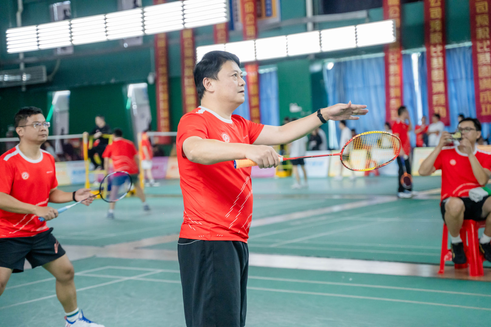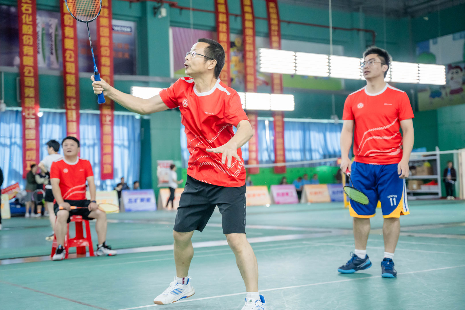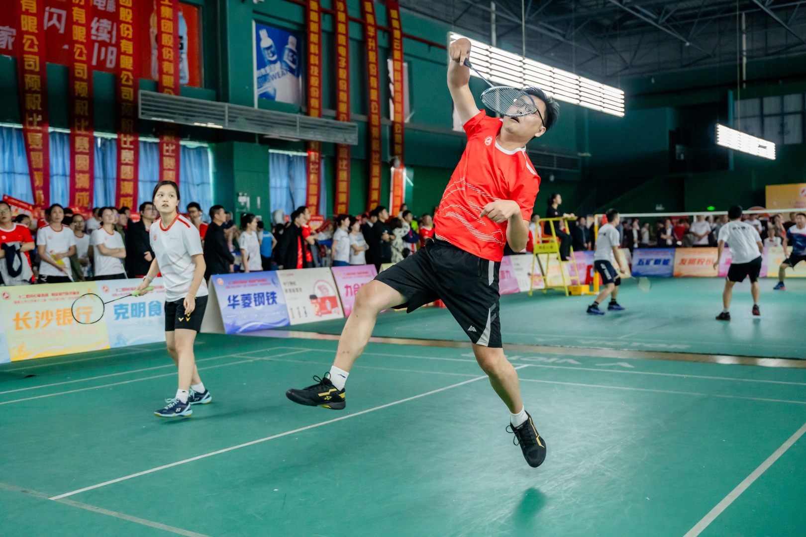 本次比赛分为高管双打、女子双打、男子双打、混合双打,赛场内,多场比赛高潮迭起,悬念丛生,不到最后一刻分不出胜负。赛场外,啦啦队员忘情的呐喊与鼓励,激励着健儿们奋勇争夺每一小分。让我们跟着下列图片一起来欣赏健儿们的英姿吧。